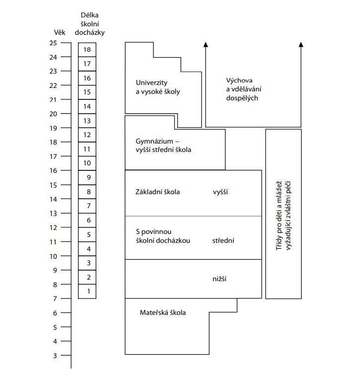 - Povinná devítiletá školní docházka, ZŠ je rozdělena na tři oddíly 1.-3.tř, 4.-6.tř, 7.-9.tř , na konci oddílu žáky čeká národní testy
